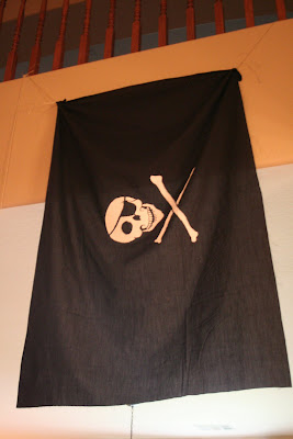 1. The flags and such: I bought some inexpensive black fabric from Hobby Lobby, and cut it into rectangles (didn’t take the time to sew or hem or anything). I printed out a graphic of a jolly roger (skull & swords) I found on the internet. Then used an exacto-knife to cut out the white parts, forming a stencil. I then painted the flag with the stencil and white craft paint. This was all done a night or two before the party while watching “The Pirates of the Caribbean,” so I could get in the mood, and not get too annoyed at the tedious task of making my stencil. I bet some of you know an easier way.