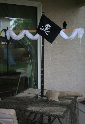 The small flag went on the mast. Denise from Little Ant Designs, sent me instructions on how to make masts out of PVC pipe, easily. But we were short on time, so ended up using some 1×2 we had around for other projects. One was a back ground for spray painting and that is why it is black and the other isn’t, but I didn’t think it would matter if they looked too pristine, since they are on a pirate ship, after all. My husband put a couple of nails in the boards where they intersect, and then we used twine to wrap around and secure them. I attached some scrap white fabric I had on hand. The crow on the top was a dollar store purchase. I was only disappointed that the weather was bad, so I didn’t get to do more with decorating outside (hence the netting piled on the table).