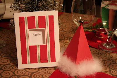 I immediately thought of these cute favor boxes. This was a “Christmas in July” themed gourmet dinner (…back in july, clearly), put on by Taisy and Amy. They made these boxes out of cardstock, and each was full of homemade caramels (yum!). Here you see it pictured with the menu/placecard.