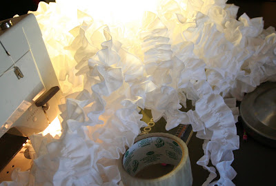 Here is a quick peek: The picture above is of some of the 87 (or so) yards of ruffles my mother sewed for me while she was here. Yes, I know. She must love us! And here is a peek at one of the applications of said ruffles: