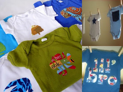 I never get tired of the idea of having guests decorate onesies. But along with the usual fabric paint why not set up fabric scraps, fusible webbing, and stencils for making appliqued onesies like these from Kojo Design. Do it yourself for double duty decor items a la Cookie Mondays’ country themed shower. You can purchase them colored or dye them yourself.