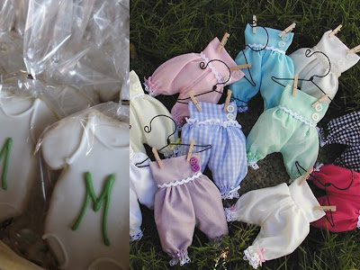 As if they haven’t had enough fun, how cute would are these bloomer satchels, hung on a small clothesline inviting guests to take one home? How about trying your hand at making a few onesie cookies in a pretty package? Creatively Satisifed has a wonderful tutorial for making them.