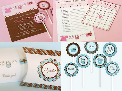 One stop shop with Sweetly Sweet’s clothesline printable files for invitations, Sweet Circles to make anything from cupcake toppers to favor tags, pillow box and baby shower games. Look at that, half the party is done for you!