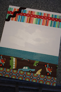 I have all these fabric scraps left over from making the quilt for the bed and decided I would try modge podging them onto something. I love photos and never have enough ways to display them so I came up with the idea of making a pseudo bulletin board out of a blank canvas I’ve had sitting around (it’s been there since the painting class I took in college – 10 years ago! I’m such a craft pack rat). I say “pseudo” because I don’t think it would be a good idea to be making pin holes in the canvas.Supplies: