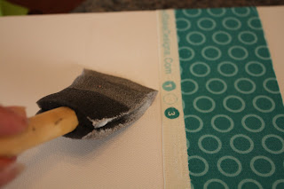I kept the canvas white because I liked the contrast, but you can, of course, paint it first if you don’t want the white. Then I put down a layer of modge podge where I wanted the first strip to go and smoothed the fabric over it.