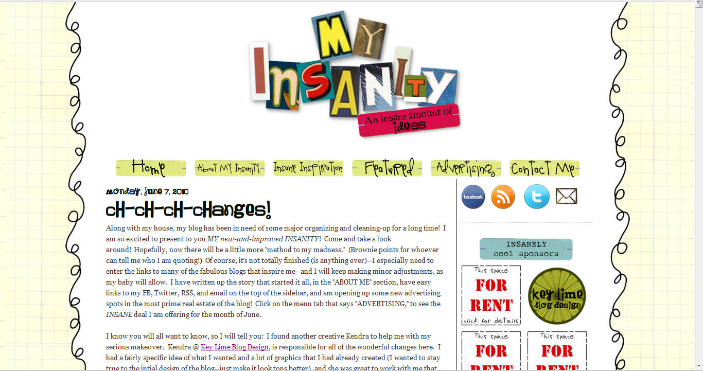 Along with my house, my blog has been in need of some major organizing and cleaning-up for a long time! I am so excited to present to you MY new-and-improved INSANITY! Come and take a look around! Hopefully, now there will be a little more “method to my madness.” (Brownie points for whoever can tell me who I am quoting!) Of course, it’s not totally finished (is anything ever)–I especially need to enter the links to many of the fabulous blogs that inspire me–and I will keep making minor adjustments, as my baby will allow. I have written up the story that started it all, in the “ABOUT ME” section, have easy links to my FB, Twitter, RSS, and email on the top of the sidebar, and am opening up some new advertising spots in the most prime real estate of the blog! Click on the menu tab that says “ADVERTISING,” to see the INSANE deal I am offering for the month of June.