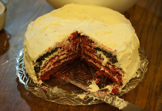 So the good news, is that red velvet cake is really yummy! The bad news is that each of my cakes kind of collapsed in the center, not giving me the thickness I needed to form my layers (especially with my “blue velvet” layer). I don’t know if that is typical with red velvet, or if it was just baker error. These were also really hard to get out of the pan, so instead of beautifully constructed layers being stacked, there was a lot of piecing going on. It did taste quite good, although my mom complained that it was too rich and sweet with all of that frosting–but she eats really healthily, so I think most people would really like it. 🙂