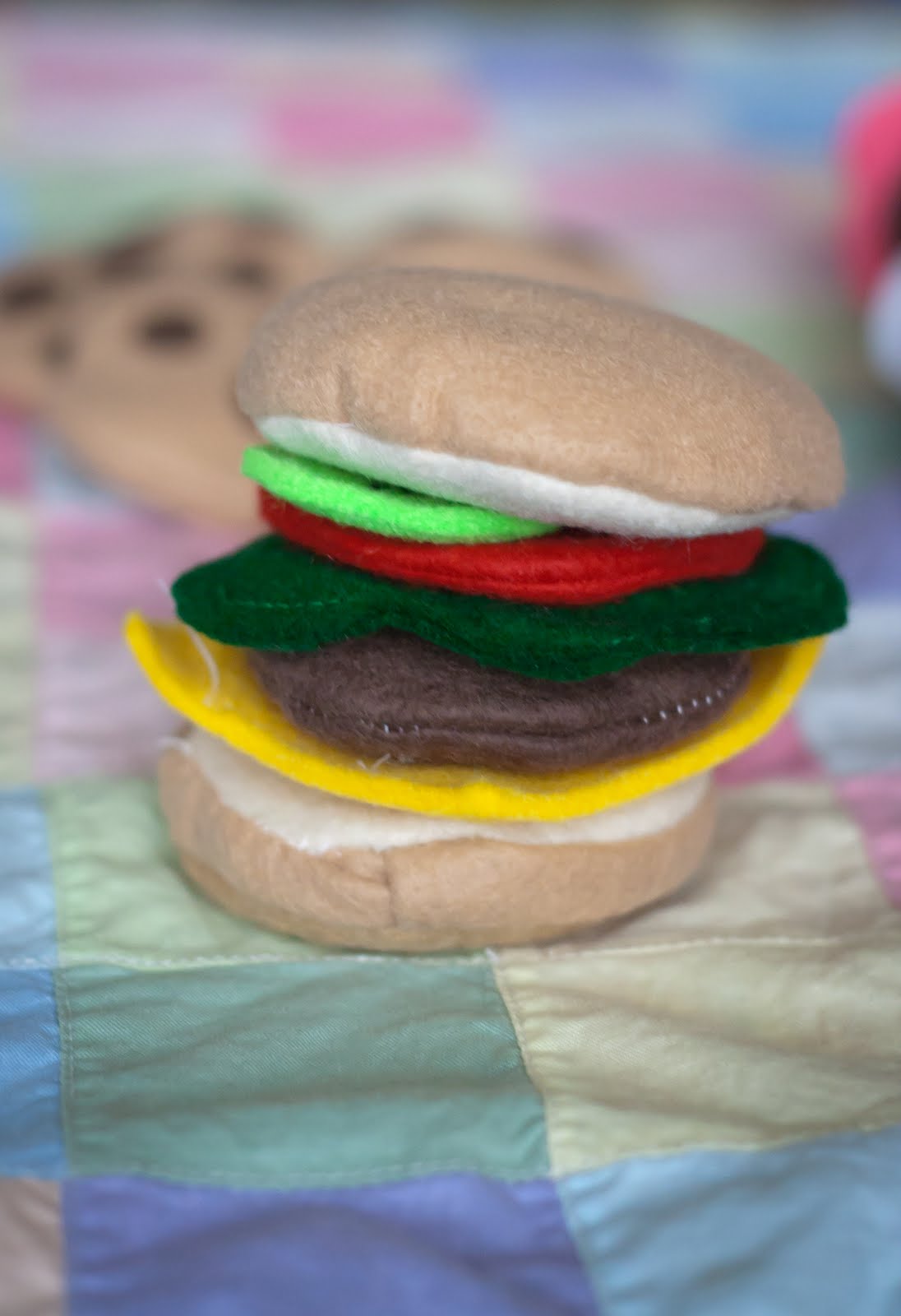Actually, these ones are done! Somewhere in the stupor of my third trimester, I agreed to do a felt food exchange with my sisters for Christmas gifts for our children. We each make one set of food 5 times. One of my sisters made these adorable french fries and burger. I should have taken close-ups of the individual parts of the burger, but she sewed the veins on the lettuce and shapes on the pickles and tomato.