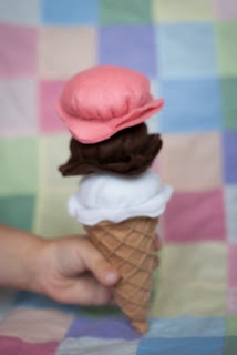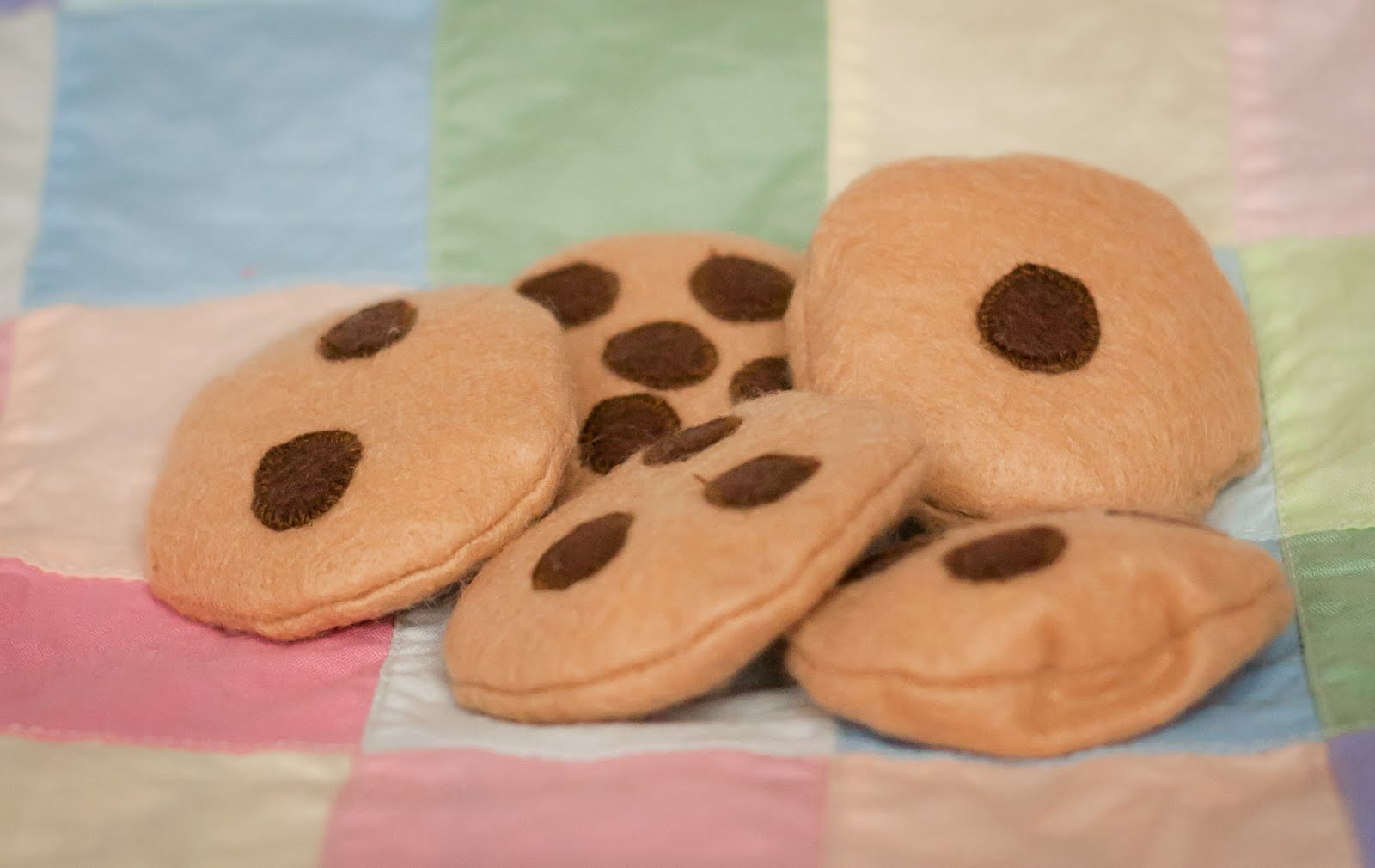 Another sister made the felt deserts. I love the ice cream cone! Each scoop of ice cream has velcro on the bottom, so they can stack on each other. The cookies she made, each have a different number of chocolate chips, so they can be used to teach counting, as well as for play.
