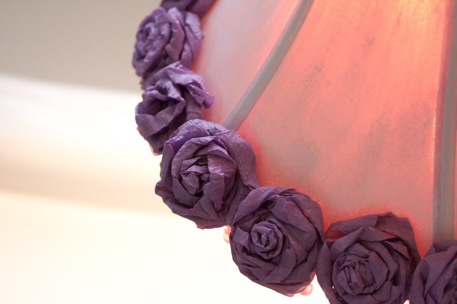 And then I started experimenting with crepe paper roses. I tried some fabric rosettes, too, but ultimately decided to hot glue the crepe paper roses around the edges of the lamp.