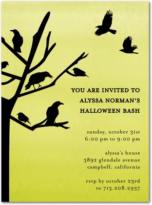 Tiny Prints has tons of great designs for all kinds of cards and invitations. Their graphics are very appealing and diverse and they have something for every occasion. I went to their site and found the invitations I would use for the two Halloween parties I want to throw this year (but probably won’t be able to throw either–due to all of the other partying I have going on in October). I want to throw a Monster Mash Bash for the kids that would look just like this invitation–bright, fun colors in graphic (not scary) monster shapes. And I’ve been thinking about a bird-themed Halloween (got a few more of those crows at Dollar Tree) for the grown-ups that this invitation would be perfect for. Think Hitchcock–scary and creepy, but not gory or ugly. There are tons more Halloween designs there. You might also want to start looking at their Christmas cards options.