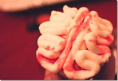 I did these brain cupcakes last year, using the Jello poke trick to add some gore on the inside and some extra jello drizzles on the outside.