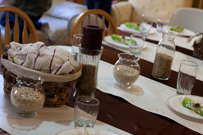 This is the appetizer/dessert table. We thought it would be nice to have a few munchies on hand for the kids (and big kids), since–inevitably–it takes a while to get all of the main dishes ready at the same time. I love the banner! We got the kids in on this project and let them glue the seeds on the letters that Trina free-handed. (She did the cool leaf too!). We alternated poppy seeds, mustard seeds, parsley, coriander, and something else I am forgetting, to form the letters.