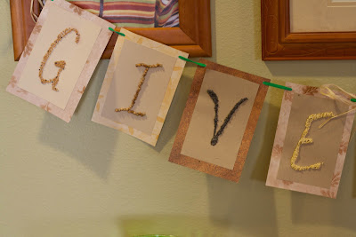 We punched holes and threaded the paper through green raffia ribbon that Trina had on hand. All of the seeds came from her pantry, and the paper from her scrapbook supply.
