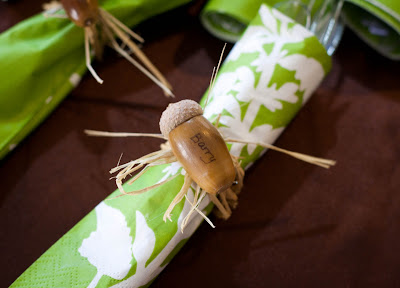 Trina had collected some acorns, and if the weather hadn’t been so cold, I would have loved to go back and collect armfuls more to use in our decorating! Instead, I featured the ones she had as the place cards. I made rustic napkin holders with raffia. I hot-glued the acorn cap to its base (they were all coming off), wrote names with a fine point Sharpie marker, and hot glued the acorn to the raffia. I like the splash of green from the IKEA napkins (which were left over from the fairy party).