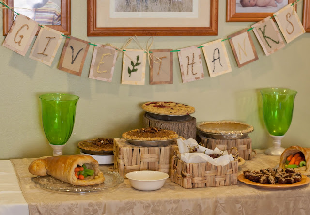 I had visions of covering the entire table with logs to hold the pies, but was only able to convince my husband to bring in this one appropriately-sized log from the woodpile. Trina picked up the baskets from the dollar section at Michaels. They worked well to hold things (like the grapes in front), or turned over as platforms for the various yummy pies that my sister, Serena, made. I’m not sure how I convinced my mom and Serena to make the bread cornucopias (they are both a bit more practical than I am), but I loved them, and thought they were a great place to put the crudités (grape tomatoes were added later) for the guests to munch on. I can’t remember where I first saw the bread cornucopia idea. Leave me a comment, if you know who I should credit! My mom just used her roll recipe that she was already making. They formed a cone out of aluminum foil and stuffed it with crumpled aluminum foil so it would keep it’s shape while baking. I think it had already been eaten on the picture on the left, but she made a little dough braid to finish off the edge of each cornucopia. The other yummy appetizer is the stuffed date platter BSB made. They had blue cheese, bacon, and shallots and were enjoyed by all of the big kids.