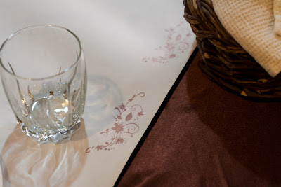 We dressed up the runners by stamping this pretty leaf design along the edges in brown ink. My 9-year-old actually did most of the stamping, and did a good job. It was a nice way to bridge the gap between the fancy satin tablecloth beneath, and the casual paper runner.