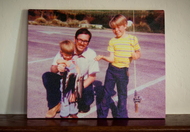 Remember how I told you about the FREE canvas offer from the Canvas People? Well, I’m finally able to show you what I ordered! This is going to be for my husband’s “man cave.” I had some old pictures on the computer from a book and slideshow I created for my FIL’s 6th b-day a few years back. I was able to quickly look through those and pick this sentimental picture from my husband’s childhood to use for this gift. BSB is really into fishing! While we were in Utah for Thanksgiving, he spent three full days out on the stream fishing in frigid weather. (No, thank you!) This picture of him with his dad and brother shows where this passion began. I think I did some editing on this photo when I first scanned it in, but I didn’t mess with it any more for this canvas. The natural antique feel of the photo makes it perfect for artwork. The only think I might have done differently, if I was starting over from scratch, is try and leave a greater margin around the edges of the photo. Remember that the image will be wrapped around the edge of the canvas, so you don’t want the important elements of the picture to print on the sides instead of the front.