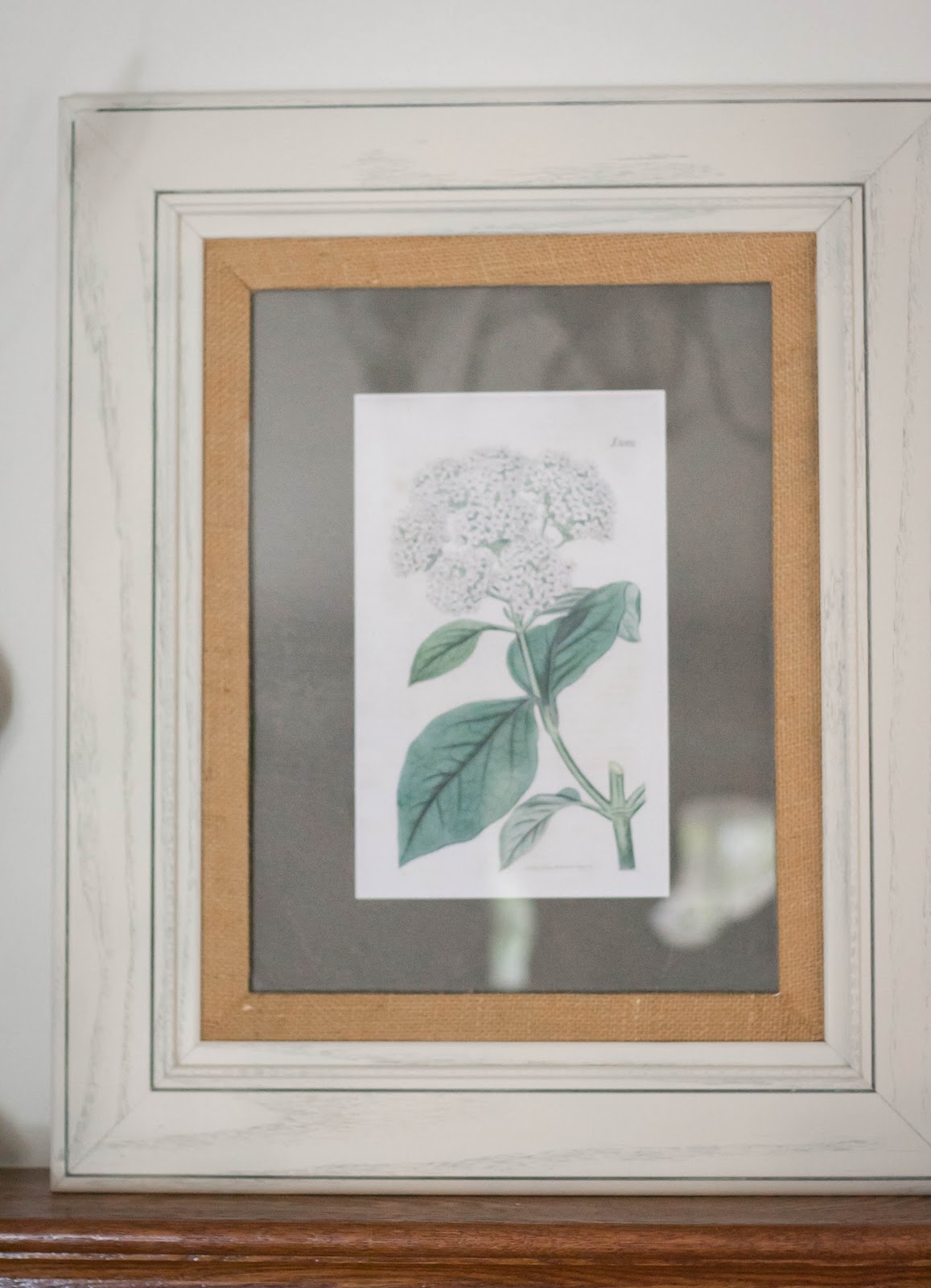 (I have a set of these from when my FIL redecorated his office–if anyone collects prints of Native American chiefs, let me know). I have plans to use them for pictures of the kids, but since that hasn’t happened yet, I put a light coat of gray spray paint on chipboard and attached this great drawing of white viburnum I printed off from The Graphics Fairy, and just leaned the frame against the wall this time. 🙂 I’m sure I’ll be changing things around for Valentine’s Day soon anyway.