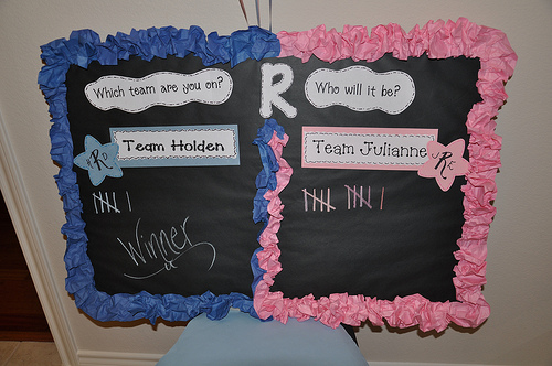 This gender reveal went with the traditional blue and pink. Julie did lots of fun activities with the family that was gathered. She made them pick a team (boy or girl) when they walked in the door.