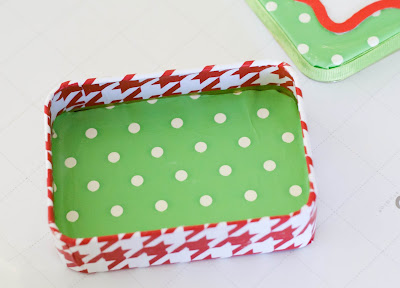 I used an exacto knife to trim the edges, and a ribbon to cover where the knife hadn’t been so exact. I had BSB print out my logo on a laser printer so it wouldn’t bleed and cut the red frame with my Silhouette. I mod podged it all on the top of the lid.