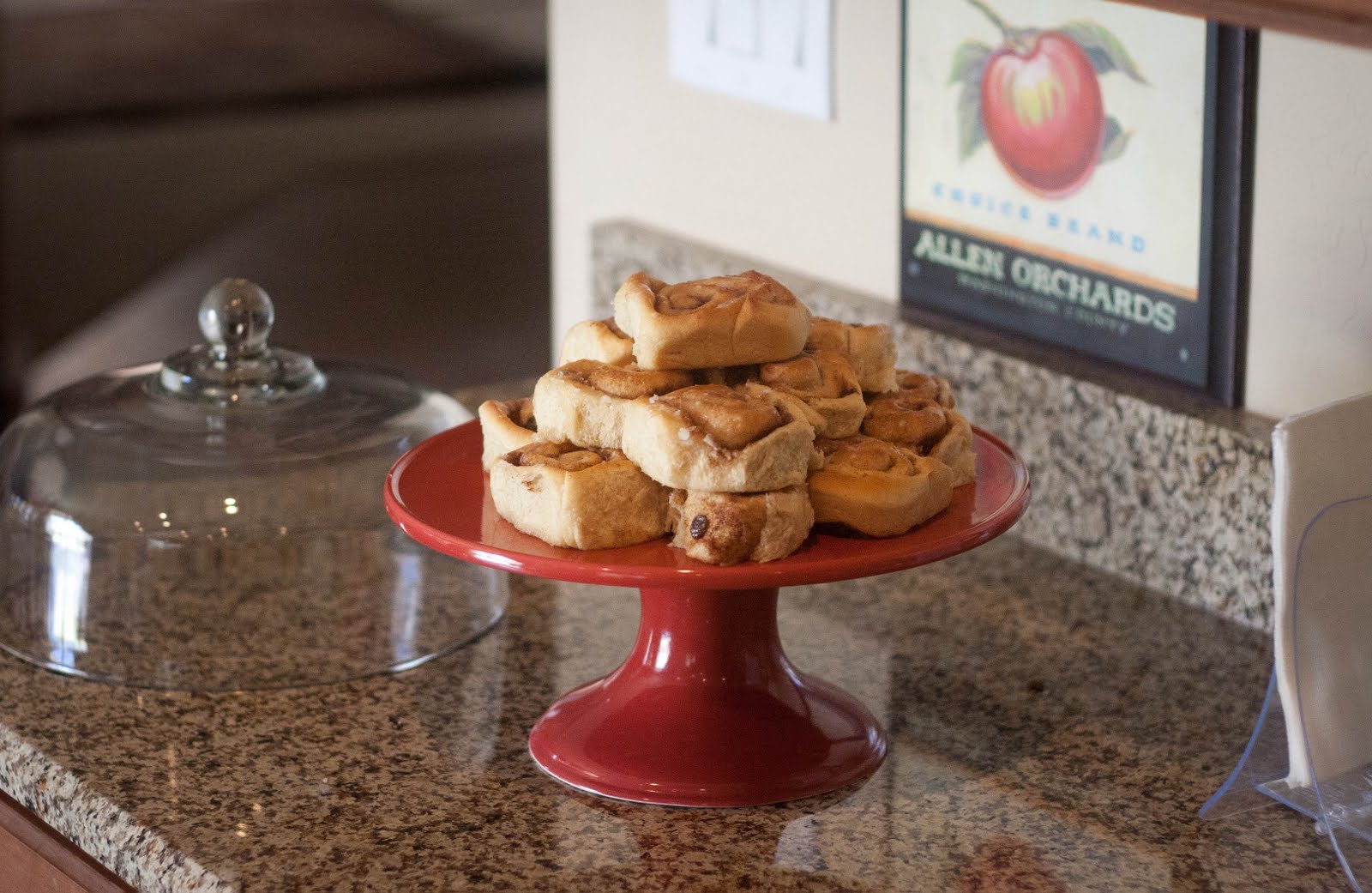 I cant tell you what an improvement this is over the norm (no before picture, but it is at least as bad as you are imagining). Those sunflowers were around for my daughter’s science fair project. I took this picture and lamented to my mother that I didn’t have any fresh cinnamon rolls for the cake stand. And…