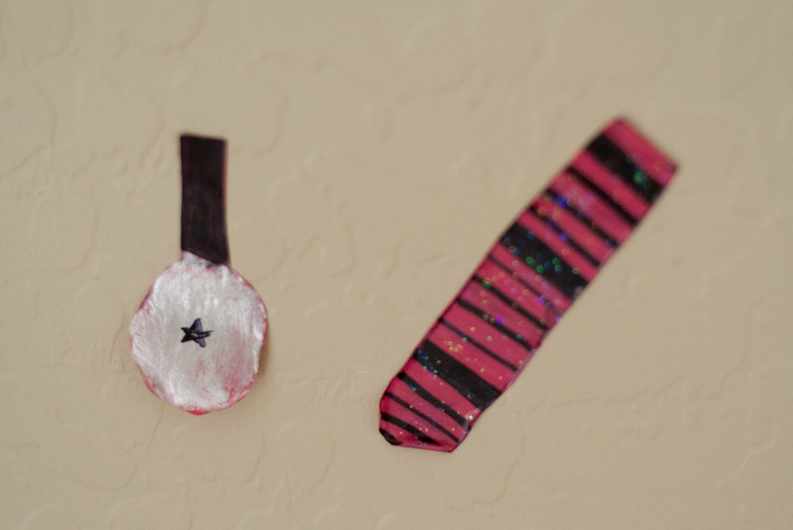 These were entirely conceived of and created by the birthday girl, herself. I had cut out another project with my Silhouette, using a dark pink vinyl and had lots of scraps left-over. She did not like the idea of throwing them away, and set out to find something to do with them (I think that is genetic–from my mom!). Anyway, she traced these shapes with a black sharpie marker and decorated them with actual sparkly nail polish. She placed them on the walls of the bathroom, to help set the mood.