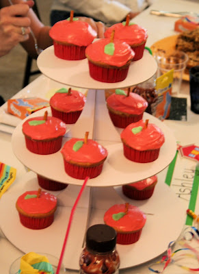 I called these “Class Party Cupcakes.” They served as a centerpiece as well as an additional dessert (although, not many people had room for them after the “final exam brownies!” They were apple-cinnamon cupcakes with a honey frosting. The decorating idea came from Martha Stewart’s kids’ food magazine.