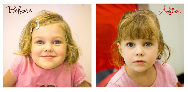 Next was Princess Tessa, who wasn’t so sure she wanted a haircut (this girl had recently tried to glue yarn to her hair so she could have Rapunzel hair), but the layers from her cute, stacked haircut were growing out kind of crazy, and her long bangs were always in her face.