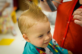 We started with the sweaty baby. He needed a haircut for sure! But I was anxious to see if they could really get him to sit still.