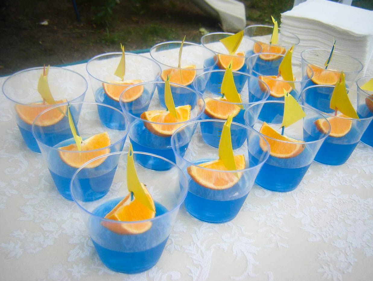 These individual sea scenes are blue jello with an orange slice boat, floating on top. Fun! Right?