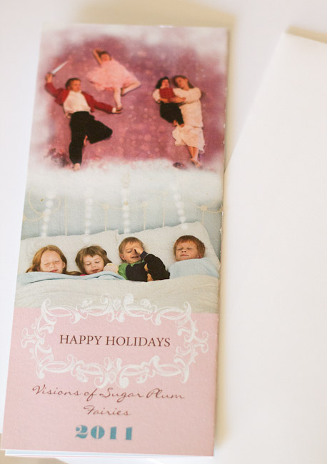 I borrowed a page from last year’s Christmas card where I had a flying angel, to make it look like my Sugar Plum Fairy was balancing on the hand of her cavalier. Getting my kids to cooperate for this shoot was no small feat, and it did require quite a lot of editing, to get the image that graced the front of the card.