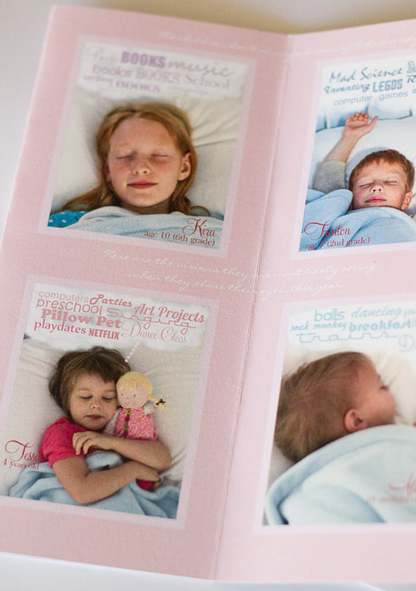 I also staged pictures of my children “nestled snug in their wee little beds.” And wrote in cloud-like bubbles what they were likely to be dreaming of, besides sugar plums.