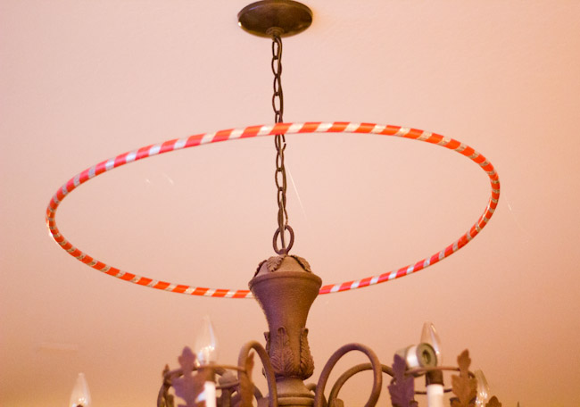 Then came the tricky party. BSB tied lengths of fishing line all around the perimeter of the PEX hoop. We used fishing line to attach the hula hoop to the chain of the chandelier. We tied the PEX pipe to the lower end of the chandelier. Some of our strings were a little tight so it warped the shape of the hoop a bit. If you are careful with the length of string, you may want to attach the PEX hoop directly to the hula hoop. Also, it might look cute and be easier to use a colorful ribbon to attach the hoops, rather than fishing line.