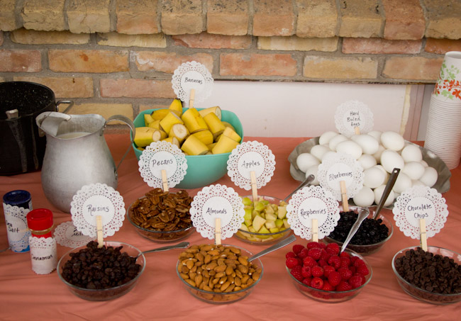 We tossed around a lot of ideas before the kids and I decided that an oatmeal bar would be lots of fun. With twenty-some kids in the mix, it is impossible to find something that everyone will eat, but that is the beauty of a bar set up! Everyone can take just the toppings they like. And some yummy toppings go a long way to take oatmeal from blah and boring to fun and exciting!