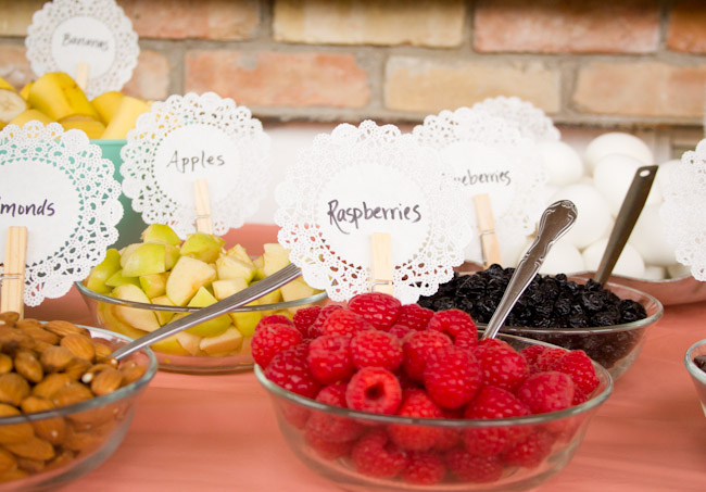 And for the pretty part, which others may not have thought was necessary, it was actually super-simple. I just brought some inexpensive (dollar store?) paper doilies and wooden clothespins. I hand-wrote the labels on the doilies. Then I clipped on a clothes pin and turned it upside down–the ends of the clothes pin straddling the sides of the bowl. Easy set-up and take down! I taped the doily labels on to the containers of salt and cinnamon.