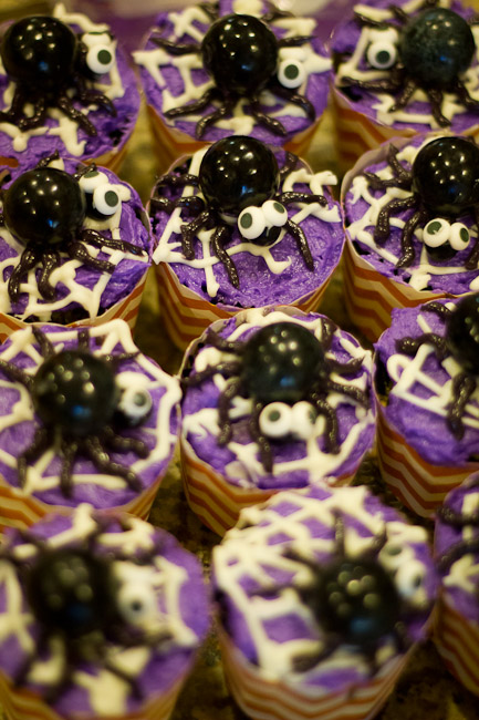 This year’s cupcakes were nearly a direct copy of Cindy’s from Skip to My Lou. I ordered the gumballs, eyeball, sixlets, baking cups, etc., all from her baking supply shop, “Sweet”. We added the white chocolate spiderwebs to the design.