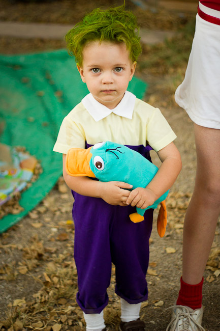 I’m pretty sure our Ferb was the most obvious and most authentic of the costumes. He is holding Perry the Platypus here, which is a dead giveaway (but Perry is also obscuring his costume a bit). My mom sewed this one up for us, since I didn’t know how we would find high waisted purple capri pants for boys. She sewed it all into one piece with a zipper in back, so we wouldn’t have to worry about keeping the pants up. Then all he needed was some crazy green hair to complete the Ferb look!