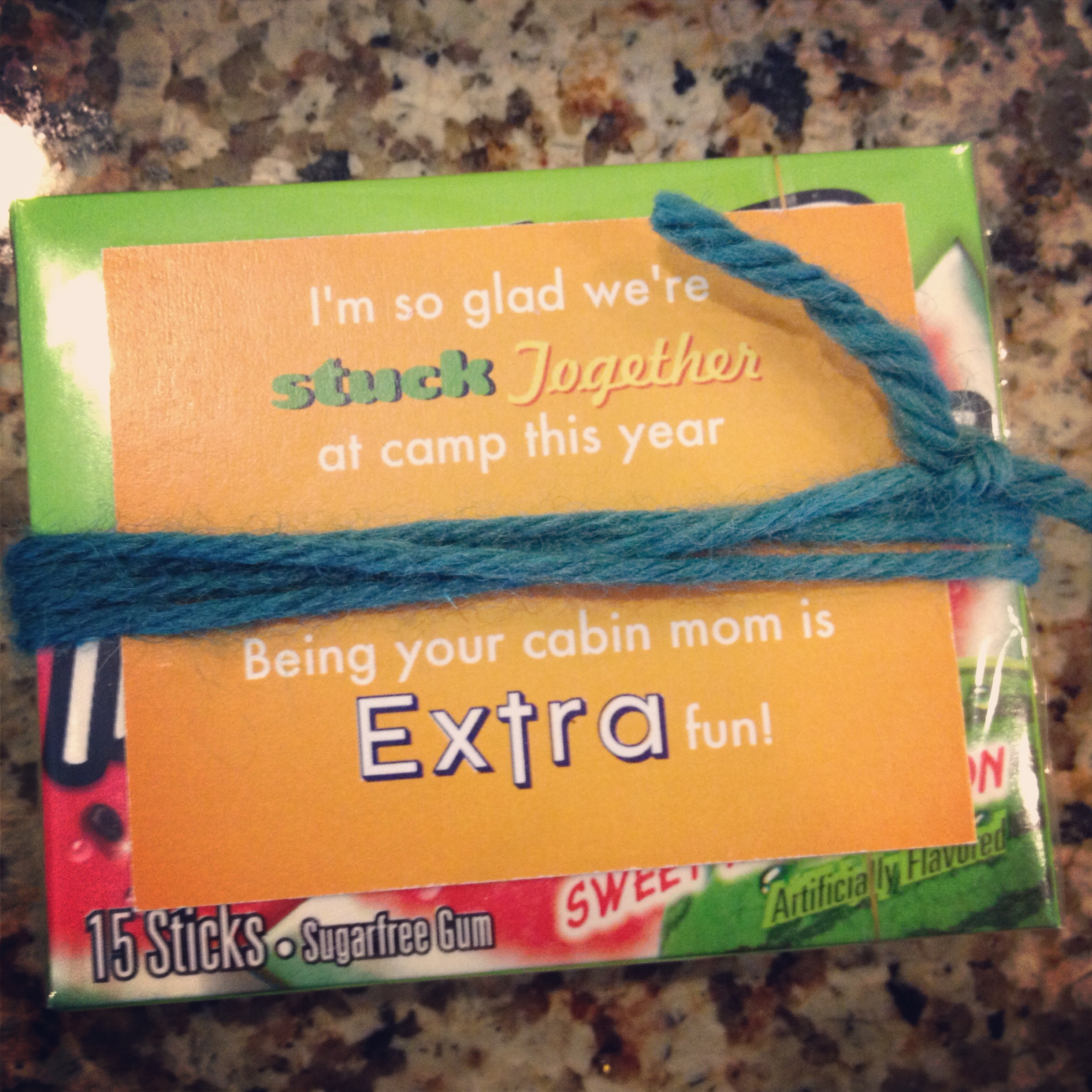 I left this little treat on the girls pillows while they were out one day. And chose the wording to tie into our theme. “I’m so glad we’re STUCK TOGETHER this year at camp! Being your Cabin Mom is EXTRA fun! I left room in the middle to wrap the gum with yarn and tie a knot, to reinforce our theme.