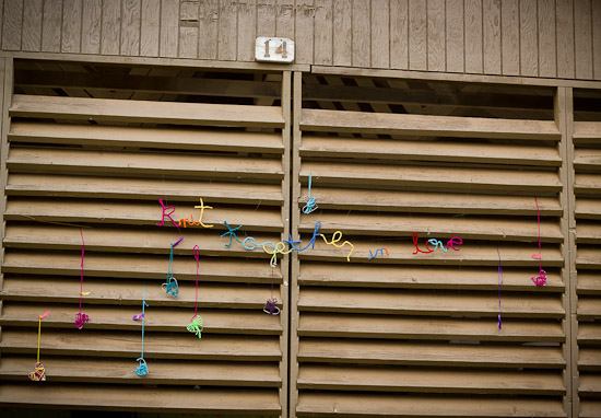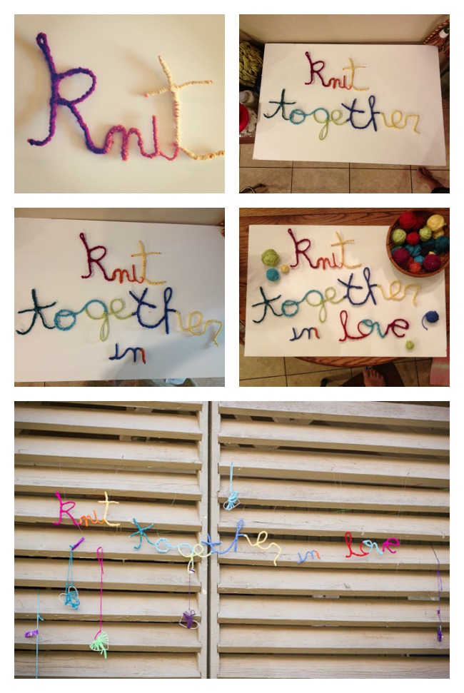 Our theme for camp this year was “Together we can make it!” This made me think of the scripture that talks about being “Knit Together in Love.” So I made that the theme for our cabin, and found lots of ways to tie in the knitting theme–more than we had time to do. I made the yarn art before going to camp and chronicled its progress on Instagram. I had read to use wire reinforced clothesline to shape your words, but the only kind I could find was coated in a thick green plastic that was stronger than the wire in holding it’s shape. So that didn’t work. I ended up resorting to pipe cleaners, which worked pretty well–especially for things like crossing the “t”. It was a bit flimsy however, and needed fishing line in several places to support it, when we put it on the front of our cabin. You just tightly wrap each letter until the pipecleaner is no longer visible. I changed the colors often, so that this would be a fun age-appropriate and modern display.