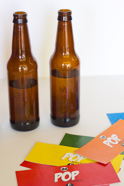 If you would like to make your own “POP music” bottles, I recommend filling the bottles with water before adding the labels, since there will likely be a bit of trial and error–adding water and dumping it out, before you get just the right pitch. More water makes a higher tone. Less water makes it lower. After tuning each note, I took a sharpie and wrote the note name on it so I wouldn’t get confused. I printed my labels on full sheet label paper at the copy store. Then just cut them in strips, peeled off the backing and applied them to the bottles.