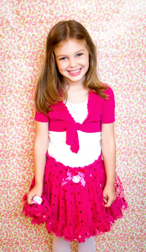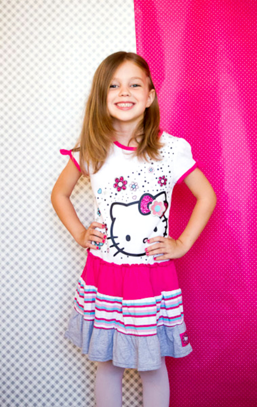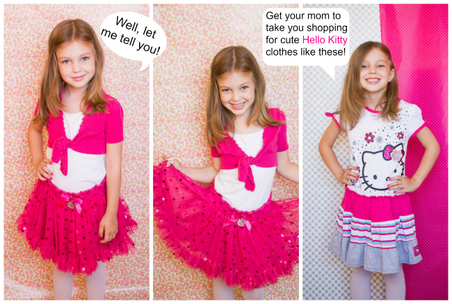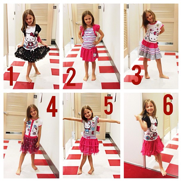 My little model loved every Hello Kitty outfit by Evy of California that she tried on and wanted to take it all home. When I realized how difficult this decision was going to be, we enlisted the help of our Instagram and Facebook friends. This was helpful, except you guys liked everything, too. We we torn between one of the outfits with the fancy skirts and the more casual but cute striped skirt. (Your top vote-getters, I think).