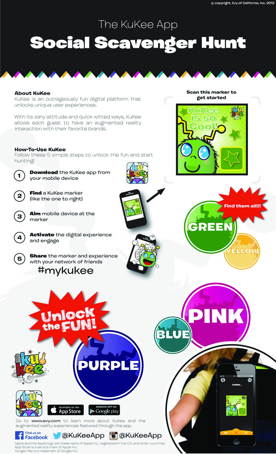First we downloaded the Free KuKee app, scanned the green marker and took a picture of ourselves with KuKee. It is a virtual scavenger hunt app, and whenever you scan a new image or “marker”, it unlocks more features. This graphic explains it a better.