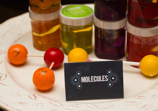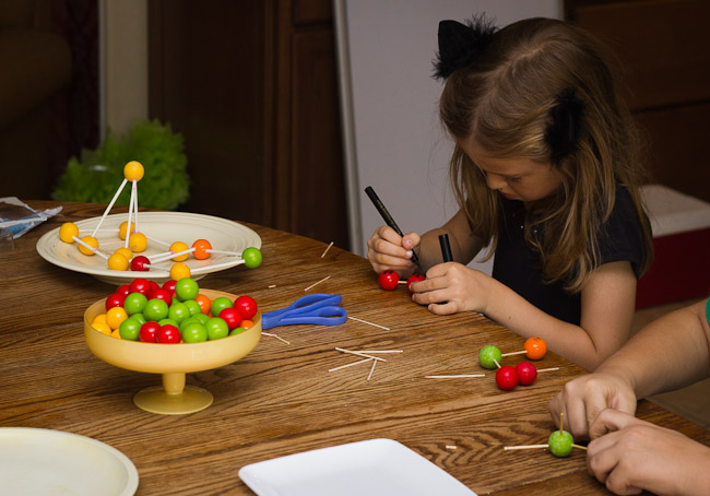 My daughter is the “lab cat” as opposed to a “lab rat.” Whatever. Anyway, we used colorful gumballs, toothpicks, and edible ink markers to write the element names on the gumballs if they so desired.