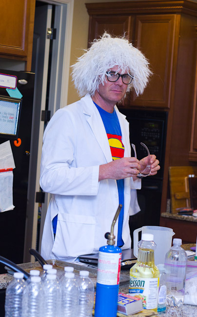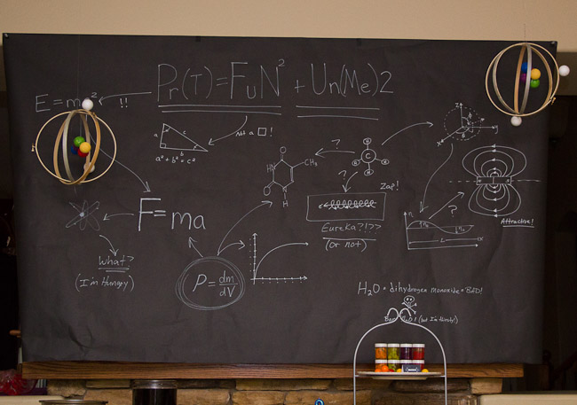 I made the “chalkboard” backdrop out of big black paper from Hobby Lobby. We used white chalk ink to draw various diagrams and equations on the “board”–the work of our mad scientist.