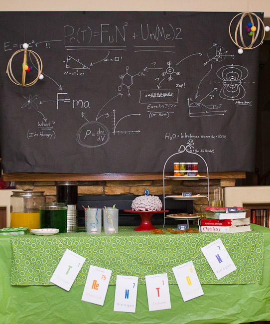 We also made sure each had an ample supply of H2O for proper brain function. Most of the favors as well as the paper goods on our table came from Oriental Trading Company. For direct links to the individual products, please visit my Science Birthday Pinterest Board.