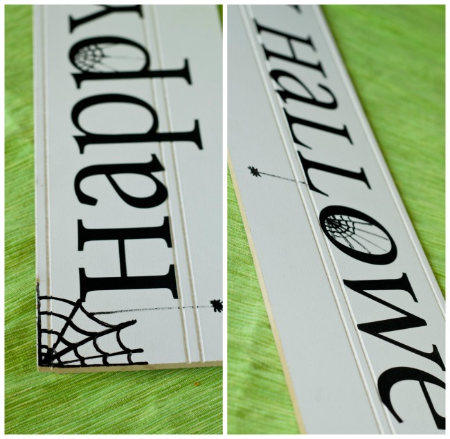 Is there anything that invites the Halloween willies into your home like lots of creepy crawly spiders? This spiderful sign was really simple to make. I originally posted about it as a blog swap over on Somewhat Simple a year or two ago. I realized it hadn’t made it’s debut here on My Insanity, yet, so I thought now would be a good time to share. Speaking of spiders, if you want a full-blown infestation in your home, be sure and check out my Pinterest board (Halloween — Along Came a Spider). There is enough spider inspiration there to keep the arachnophobes away for years.I started with a scrap piece of beadboard left over from another project that was headed for the garbage (FREE!). The great thing about Halloween is you want it to be a little rough around the edges, so most any old scrap could work. It happened to be the perfect length for these vinyl words I had purchased at Hobby Lobby at their after Halloween clearance the year before (cheap!). Many of us have vinyl cutting machines now and could easily cut similar lettering. You could also consider stenciling or even free-handing if you are artistically inclined.