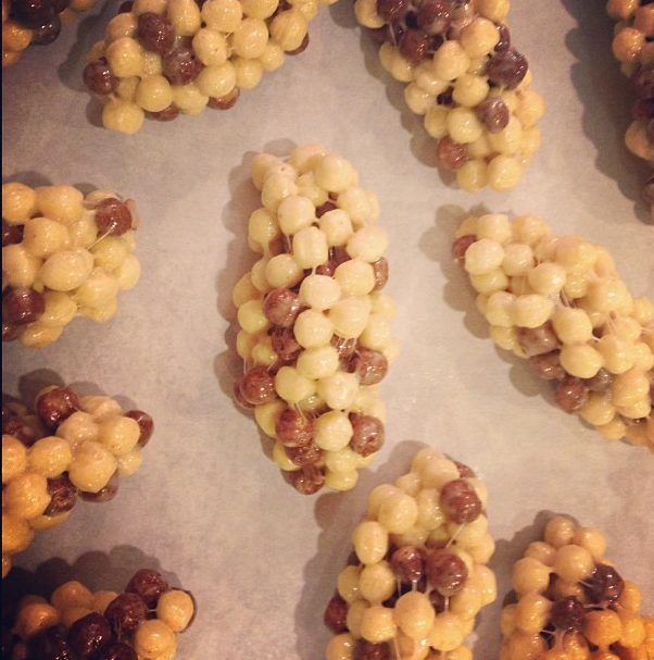 I simply melted marshmallows and butter following the recipe I would use to make Rice Crispy Treats, but instead of rice cereal I added a mix of Kix and Cocoa Puffs (or maybe generic versions of these). I used less of the cocoa cereal than the corn cereal so it would give that random look of indian corn. I put plastic baggies on my hands and coated them in a thin layer of butter, so that I could pick up the cereal mixture and shape it into oblong corn cob shapes. At this point, I posted an Instagram picture to make sure people could tell what I was going for. They did, but I think it was more clear when I added the dried corn husks. When the cobs were set, I wrapped them in cornhusks, like the kind you would buy for tamales–look in the Mexican food section of your grocery store. Then I used a small piece of twine to tie each end. I used the Tom Kat Studio Thanksgiving printables for the name tags. I just punched a hole in one corner and tied it to the twine.