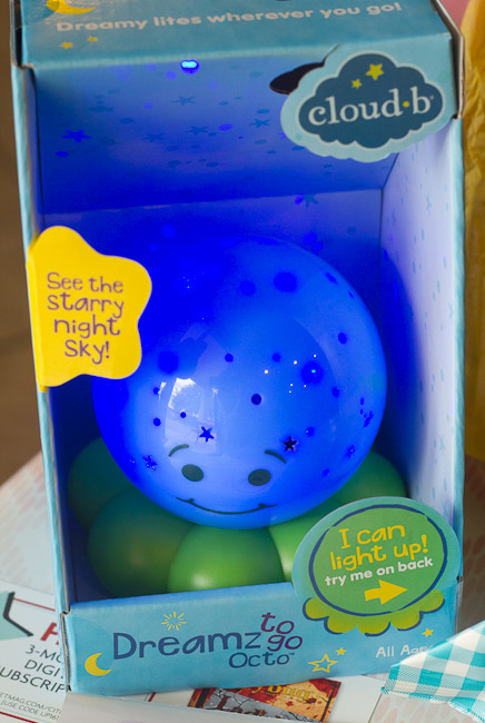 My kids were really excited by this light-up octopus and decided it should be a present for our new baby when it comes. It can glow in green or blue light and scatters stars across the ceiling.