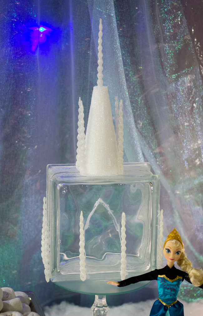 I actually tried to figure out a way to get a real ice sculpture or rather, and ice castle frozen from a mold, but between the lack of a mold and the warmth of Phoenix, the icy ice castle was not meant to be. Still, I created an icy looking edifice without the freezing temperatures. It may not be quite as magnificent as the palace Elsa builds, but it gave the effect we were going for on the table. I just made it from a glass block, a styrofoam cone, icicle ornaments, and hot glue.
